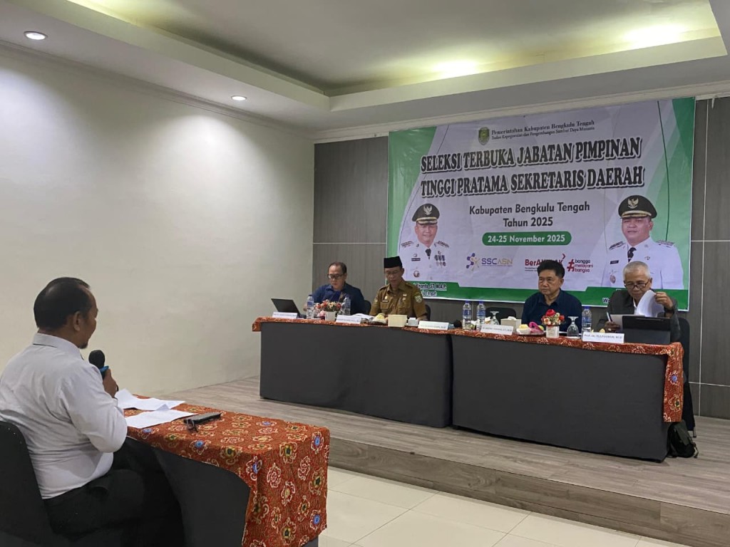 Bengkulu Tengah, Selasa 25 November 2025 — Panitia Seleksi Terbuka Jabatan Pimpinan Tinggi Pratama Sekretaris Daerah Kabupaten Bengkulu Tengah melaksanakan tahapan Penulisan Makalah, Presentasi dan Wawancara bertempat di Hotel Grage Bengkulu .