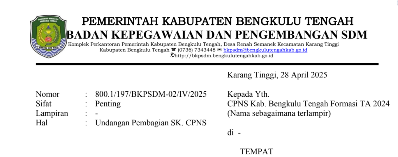 Website BKPSDM Bengkulu Tengah berfokus pada manajemen ASN secara menyeluruh-mulai dari perencanaan kebutuhan, rekrutmen, pengangkatan, hingga pengembangan karier dan kinerja. Informasi seleksi ASN/PPPK, pelantikan, mutasi, dan pembinaan tersedia secara transparan. Dilengkapi akses ke SIMPEG, e-Kinerja, regulasi, dan SOP, website ini mendukung pembentukan ASN yang profesional, berintegritas, dan berAKHLAK.