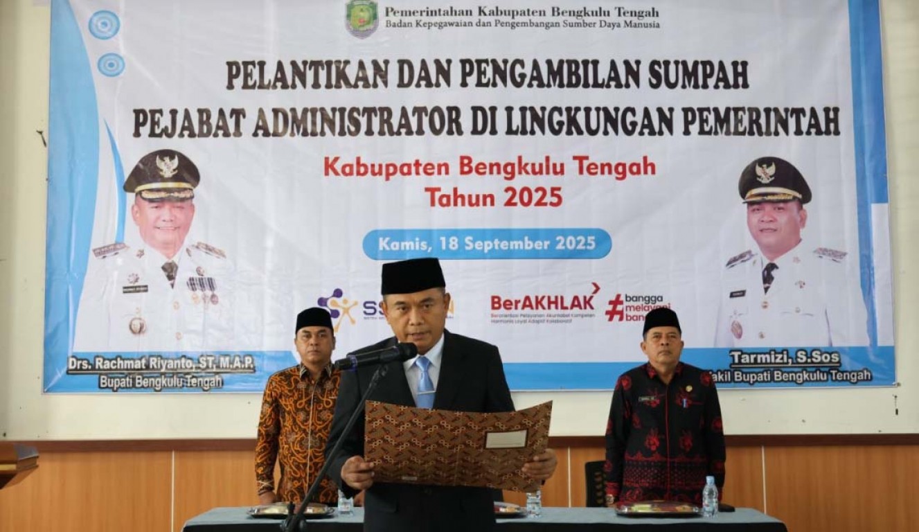 Bengkulu Tengah, Kamis 18 September 2025 – Pemerintah Kabupaten Bengkulu Tengah melaksanakan Pelantikan dan Pengambilan Sumpah Jabatan Pejabat Administrator (Eselon III) di lingkungan Pemkab Bengkulu Tengah yang diikuti oleh 63 orang pejabat administrator.